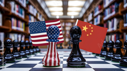 © Anusa, Naklejka premium Chess Match Between Black and White Pawns Representing Global Conflict and Diplomacy