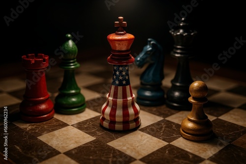 © soysuwan123, Naklejka premium Chess pieces on a board with a central king featuring the American flag, surrounded by various colored pieces in a dimly lit setting.
