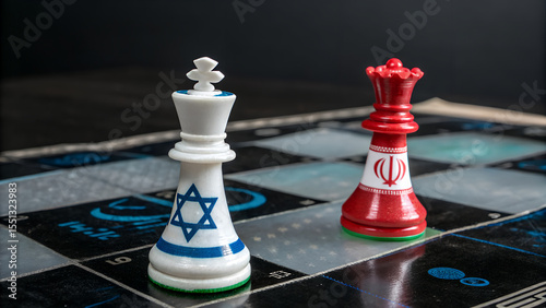 © Drago Designer, Naklejka premium Chess pieces representing israel and iran face each other on a checkered board in a standoff