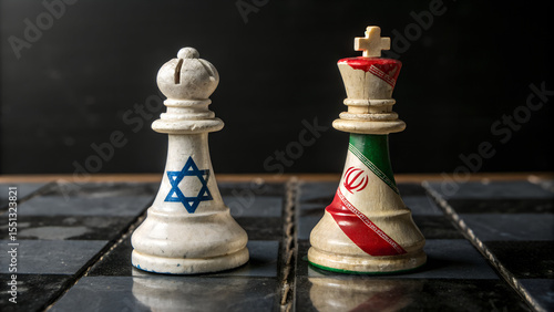 © Drago Designer, Naklejka premium Chess pieces representing israel and iran face each other on a checkered board in conflict