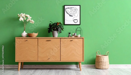 © Supriono, Obraz premium Chest of Drawers with a Green Wall Mockup