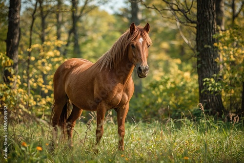 © AkuAku, Obraz premium Chestnut-colored horse standing amidst forest trees