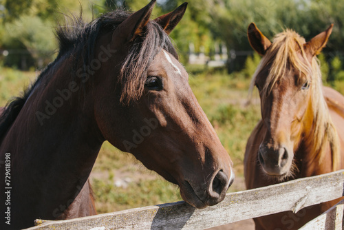Naklejka premium Chestnut-colored horses on a farm in a paddock.