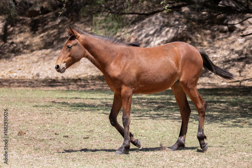 Fototapeta premium Chestnut colored young wild horse in the grass