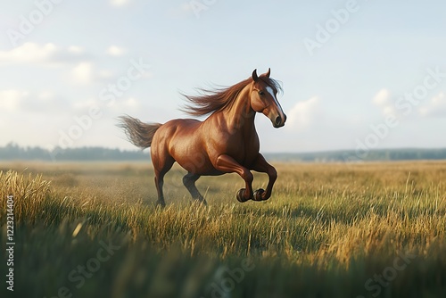 © Rayhanios, Obraz premium Chestnut horse galloping across field