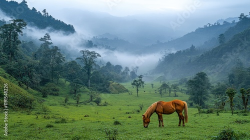 Obraz premium Chestnut Horse Grazing in Misty Mountain Valley