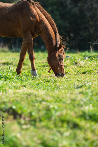 Naklejka premium Chestnut Horse Grazing in Sunlit Green Meadow