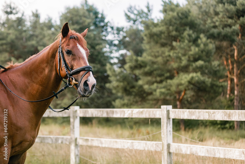 Fototapeta premium Chestnut horse head with black leather halter and beautiful eye with long...