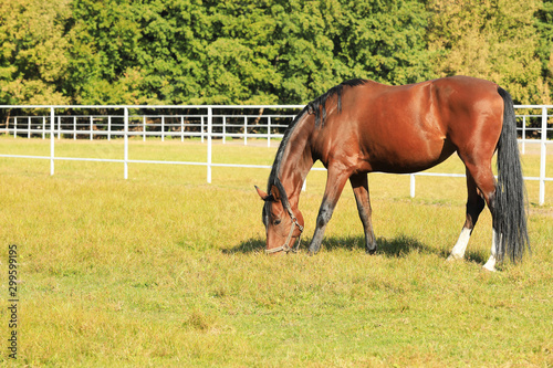 © New Africa, Fototapeta premium Chestnut horse in bridle grazing on green pasture