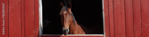 © Andrii Zastrozhnov, Obraz premium Chestnut horse peeking through red barn window on sunny day