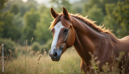 © Khamdani, Fototapeta premium Chestnut Horse Portrait, Golden Hour Meadow, Star-Blaze Marking