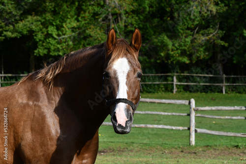 Fototapeta premium Chestnut horse with a white blaze standing in pasture looking at photographer