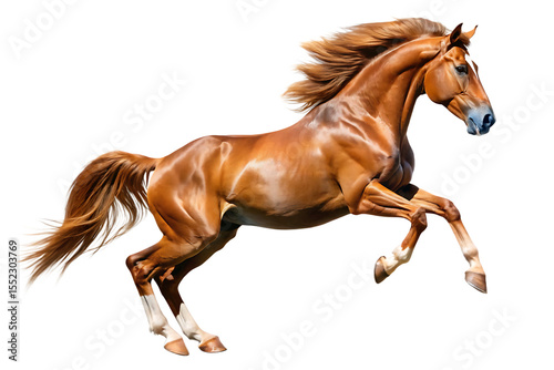 © khaledSaifulllah, Obraz premium Chestnut horse with flowing mane and tail captured mid-leap against a black background isolated on a transparent background