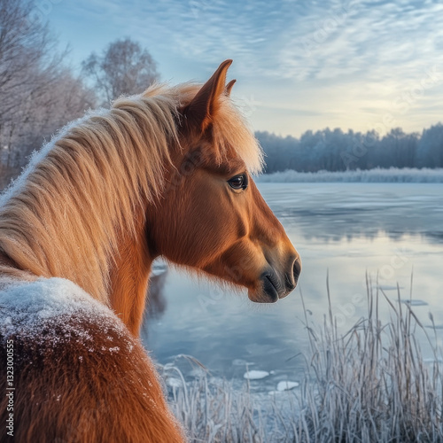 © Supawit, Obraz premium Chestnut horse with snow-covered mane standing beside a frozen lake, peaceful and stunning, UHD 8K