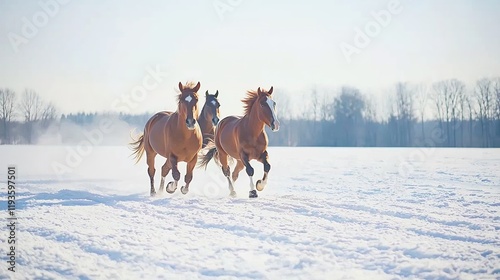 © Faruq, Obraz premium Chestnut horses galloping across snowy field; winter landscape