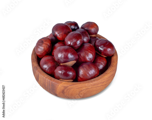 © Erik Nurshin, Obraz premium Chestnut in Wooden Plate Isolated on White Background. File with Clipping Path.