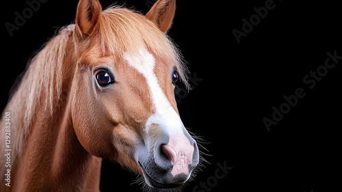 Fototapeta premium Chestnut pony portrait, black background, equine photography, website banner