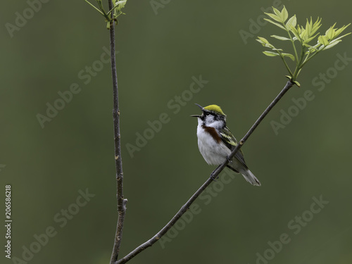 Fototapeta premium Chestnut-sided Warbler Singing in Spring on Green Background