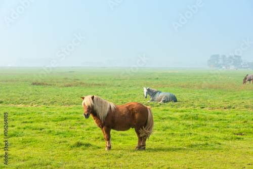 © dvoevnore, Fototapeta premium chestnut stallion grazing on green grass