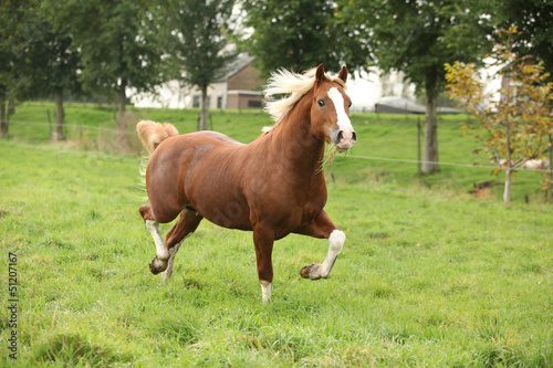 Fototapeta premium Chestnut welsh pony with blond hair running on pasturage