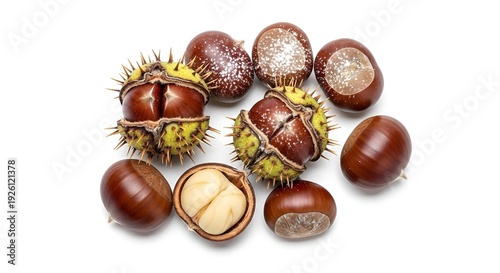 © Nur, Obraz premium Chestnuts and Chestnut Shells on White Background.