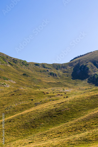 © Ldgfr Photos, Naklejka premium Chevaux lourds en liberté broutant de l’herbe dans le quartier d’estime de Campsaure-Couradilles-Pesson, dans les Pyrénées à la frontière franco-espagnole près de Bagnères-de-Luchon