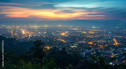 Obraz premium Chiang Mai city at night from a mountain top, with beautiful lights and a...