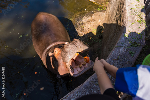© bubbers, Fototapeta premium Chiang Mai , Thailand - January, 19, 2020 : Hippopotamus in the zoo are eating carrot from the tourist in Chiangmai zoo.
