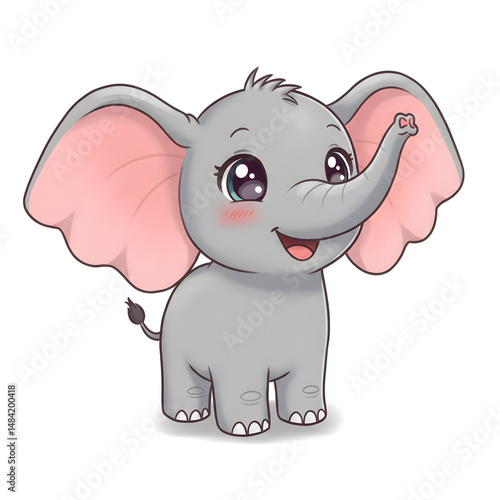 © Juliana, Fototapeta premium Chibi baby elephant with ears spread wide and trunk raised, joyful eyes and blushing cheeks