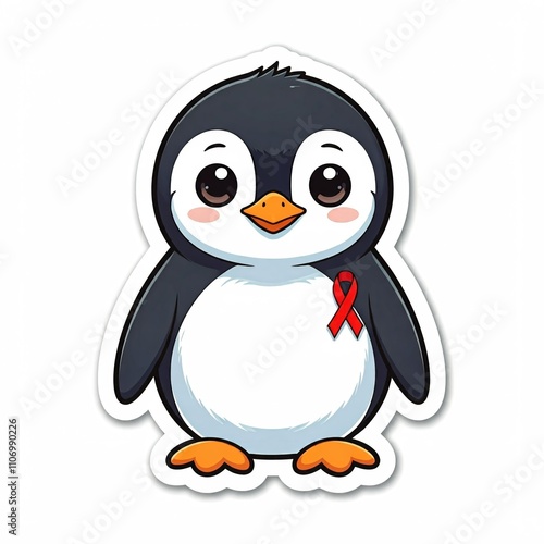 Obraz premium Chibi penguin with red ribbon on its flipper, celebrating World AIDS Day.
