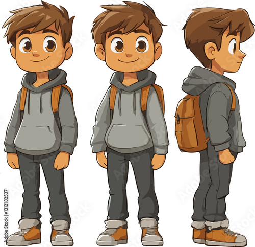 © Alghas, Naklejka premium Chibi-style character turnaround of a young boy with brown hair, wearing a hoodie, backpack, and sneakers. Cute and stylish anime-inspired design for character reference or animation