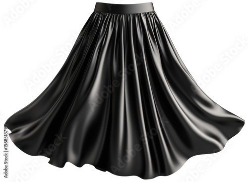 Obraz premium Chic black satin midi skirt with a shiny, luxurious texture, knee-length design, isolated on a transparent background. Perfect for elegant evening wear, formal outfits, or high-fashion styling.