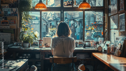 © JKLoma, Naklejka premium Chic cafe vibe: Relaxed weekend with stylish, intellectual 20-year-old Asian woman.generative ai