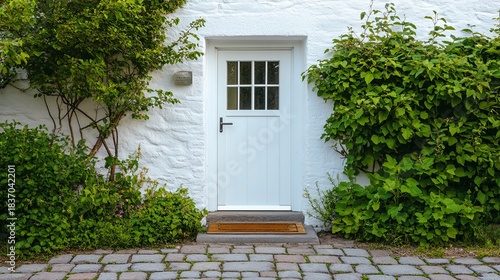 © neirfy, Naklejka premium Chic home facade, Modern exterior featuring vibrant plants and artistic embellishments, Stylish front of residence displaying lively greenery and decorative art elements
