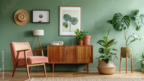 © Lasvu, Obraz premium Chic living room setup with framed poster, comfy chair, wooden cabinet, side table, plants, and decor against sage green wall. Blank space for text.