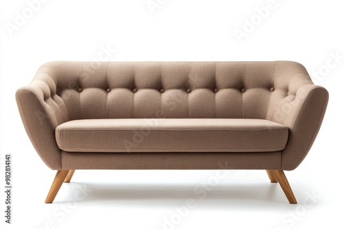 Fototapeta premium Chic modern sofa with button tufts and angular wooden legs isolated white background , ai