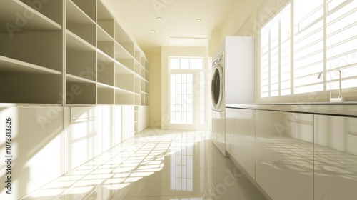 © Jakkarin, Obraz premium Chic Modern Spanish Laundry Room with Stylish Storage Solutions and Colorful Accents