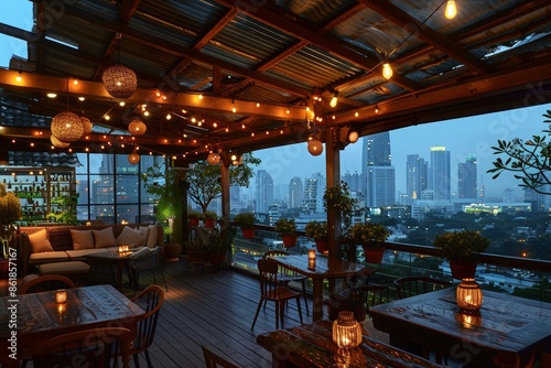 Naklejka premium Chic Rooftop Bar with Solar Powered Lighting and Stunning City Skyline View...