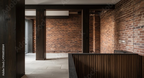 © vxnaghiyev, Obraz premium Chic studio apartment decorated with brick walls and elegant wooden columns