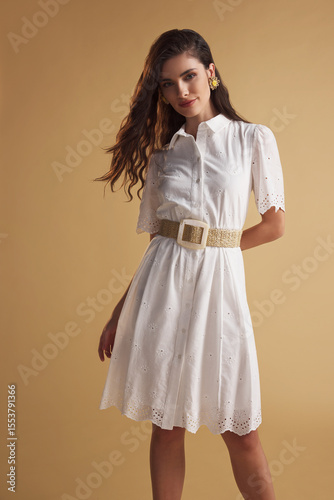 © Cumhur, Fototapeta premium Chic young woman in a short-sleeve white eyelet dress with a woven belt and floral earrings, posing gracefully against a warm beige background. Perfect for fashion, beauty, and lifestyle themes.