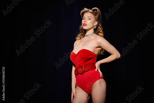 © Bliss, Fototapeta premium Chic young woman showcasing a stylish red ensemble in a modern fashion setting