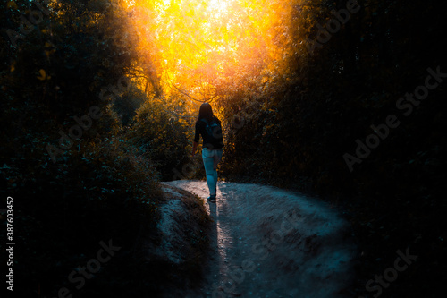 © MiguelÁngel Olivares, Fototapeta premium Chica bosque puesta de sol