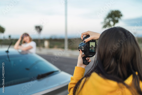 © MiguelAngelJunquera, Obraz premium Chica joven atractiva rubia con bandera americana