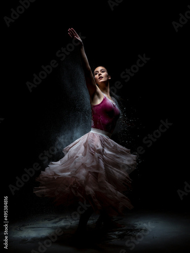 © Sinu Mora, Fototapeta premium Chica joven bailando en movimiento con polvos de harina en dispersión con fondo oscuro. Baile y danza artística.
