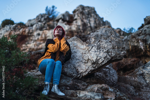© MiguelAngelJunquera, Naklejka premium Chica peliroja en parque natural tomando fotogarfías