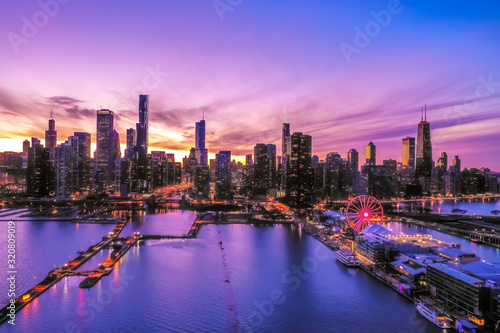 © blvdone, Obraz premium Chicago centrum miasta skyline wieczorem zachód słońca
