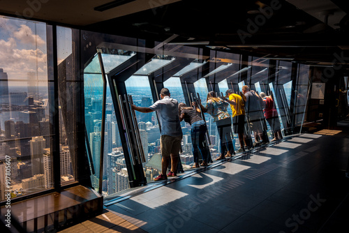 © Alexander, Obraz premium Chicago, Illinois, USA - Aug 15, 2019: Tilting glass at John Hancock Center observation area