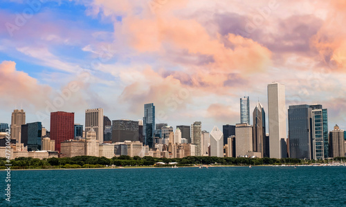 © CK, Fototapeta premium Chicago, Illinois, USA downtown skyline from lake Michigan, Chicago downtown skyline at dusk,