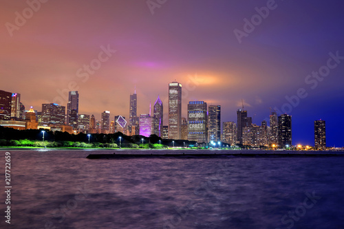Fototapeta premium Chicago, Illinois, USA - June 22, 2018 - The Chicago skyline at night after a...