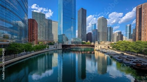 Naklejka premium Chicago River Skyline Reflection: A Stunning Urban Panorama